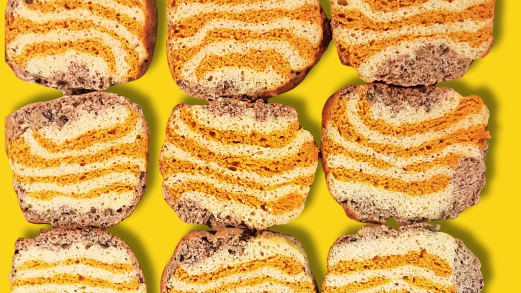 This colorful artisan bread celebrates the Diada de Sant Jordi with its vibrant stripes of sobrasada, Emmental cheese, and walnuts — symbolizing the Catalan flag. Each slice offers a delicious blend of flavors, crafted with care using Tritordeum flour for added nutrition and sustainability.