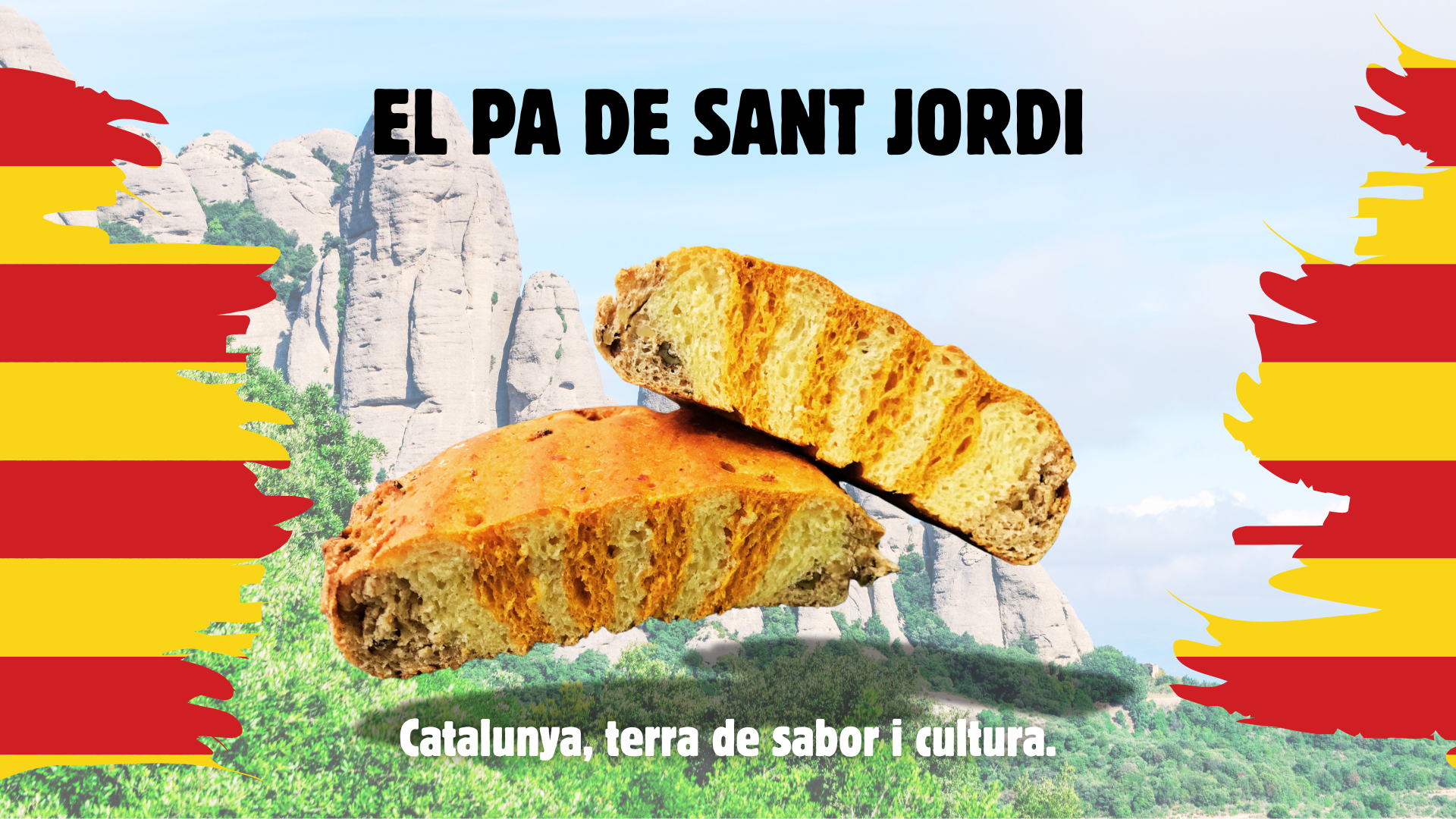 This colorful artisan bread celebrates the Diada de Sant Jordi with its vibrant stripes of sobrasada, Emmental cheese, and walnuts — symbolizing the Catalan flag. Each slice offers a delicious blend of flavors, crafted with care using Tritordeum flour for added nutrition and sustainability.
