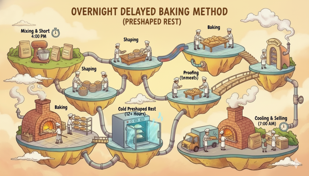 - Labor Scheduling: The delayed method is key to attracting and retaining skilled bakers, as it shifts the most intense labor (shaping/baking) to later, more humane morning hours (e.g., 4 AM vs. 1 AM).