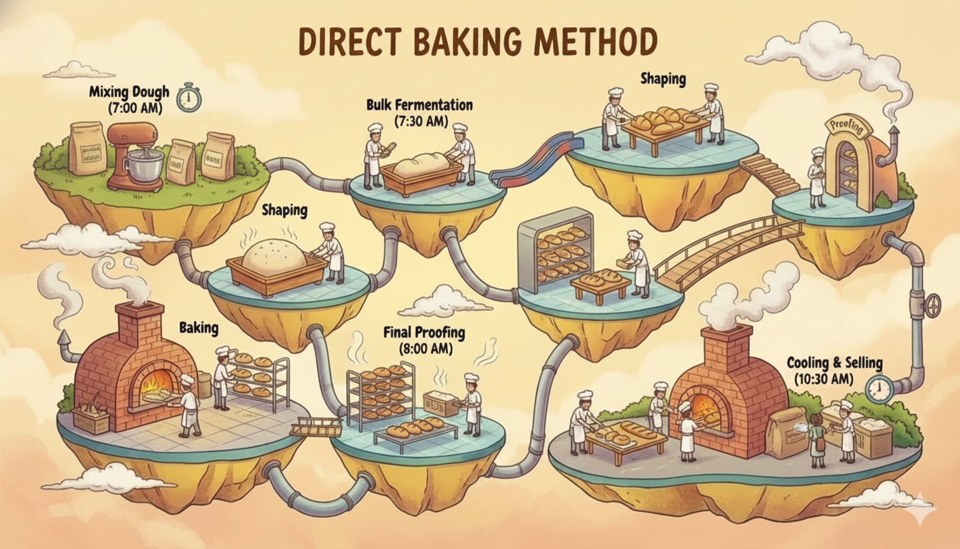 The direct method completes all dough processes—mixing, proofing, shaping, and baking—within a single, concentrated workday, typically 4–8 hours.