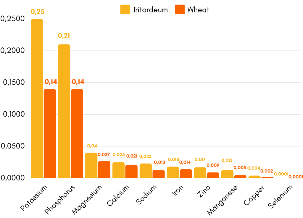 Beyond fiber and antioxidants, Tritordeum flour offers a well-balanced macronutrient composition with approximately 15-18% protein, superior to many common cereal flours. It also has a higher mineral (ash) content, reflecting a richer supply of essential micronutrients such as potassium, phosphorus and magnesium. These nutrients contribute to overall wellness, supporting muscle function, energy metabolism, and immune defense [5].