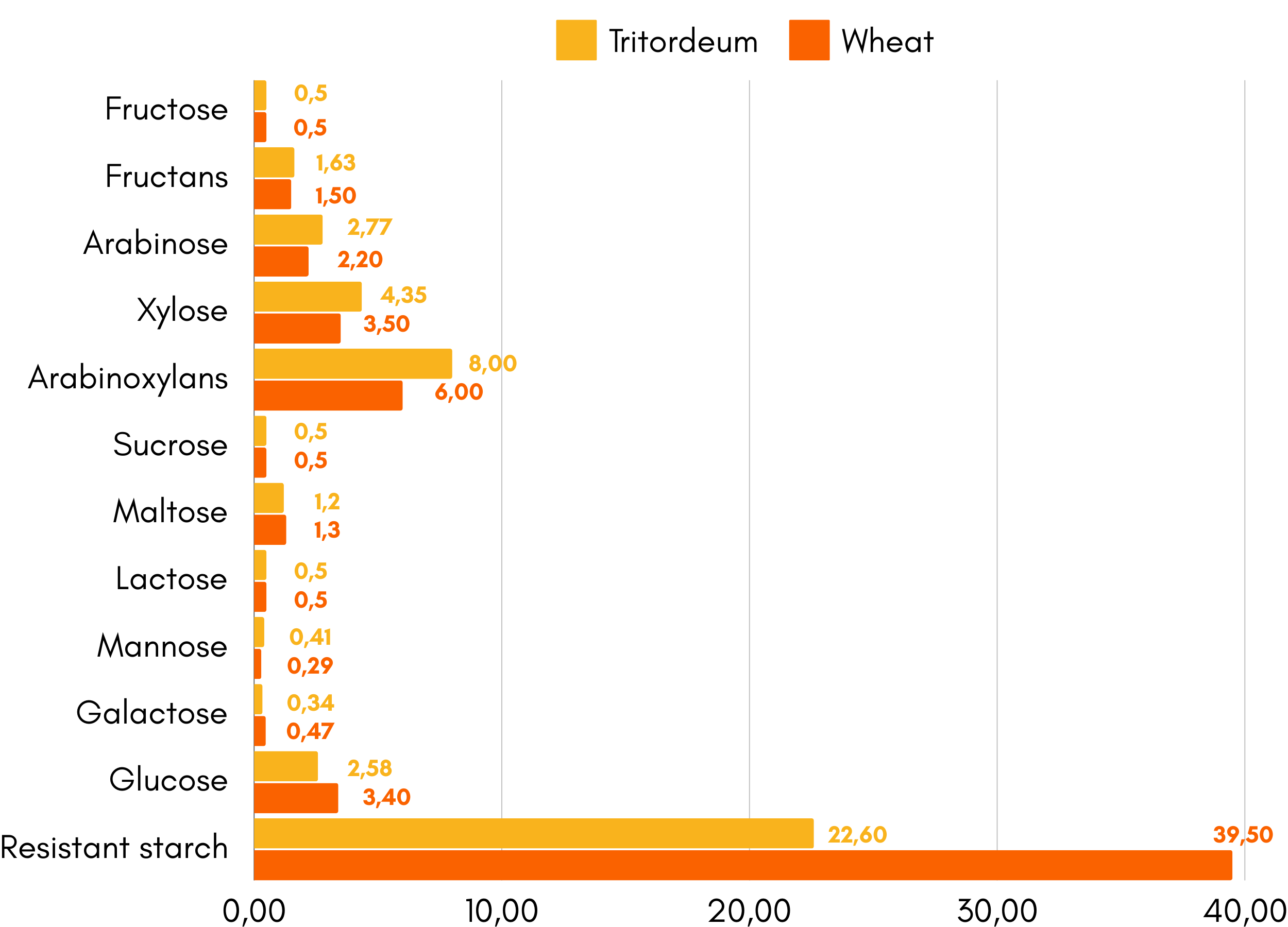 Tritordeum flour contains elevated levels of dietary fiber, especially arabinoxylans and fructans, which are prebiotic fibers known to promote the growth of beneficial gut bacteria. These fibers enhance digestive health by improving bowel regularity, modulating blood glucose levels, and reducing cholesterol absorption. With crude fiber contents around 13%, Tritordeum surpasses many traditional cereal grains in fiber richness, contributing to a feeling of satiety and better metabolic health [2].